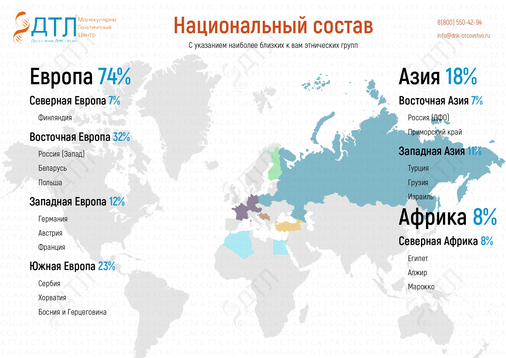 В нашем центре «ДТЛ» вы можете пройти ДНК анализ на национальность и узнать генеалогические корни. Возможно, среди ваших предков были евреи, карелы, осетины, молдаване, чеченцы, белорусы и многие другие.